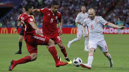 La primera medida consistió en poner a Isco pegado a la raya izquierda y a Lucas en la derecha. Resultó que Carvajal y Alba se toparon con sus propios compañeros en sus progresiones por las bandas. El campo se abrió pero las jugadas se hicieron un poco más predecibles. La presencia de Costa en el medio del ataque, por otra parte, provocó el atasco que previó Queiroz. Privado de espacios por un rival que se cerró con un orden escrupuloso en su área, el punta no dispuso de ocasiones porque no pudo correr. En sus intentos por asociarse con los mediapuntas, con Silva e Iniesta, apenas consiguió alguna descarga limpia. Por momentos, Costa cerró vías de acceso a la portería de Seiranvand en lugar de abrirlas. Los españoles se retiraron al descanso con caras largas.