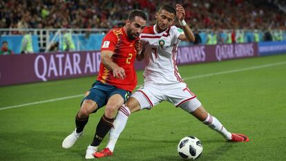 Valiente, rápido y buen lector de los tiempos del juego, Carvajal goza del una reputación única en el mundillo de los directores deportivos: es el mejor lateral derecho del planeta para defender en campo contrario. Un puntal para equipos que aspiran a controlar el balón. En su opinión, España no está jugando mal en el arranque del torneo. Solo le ha faltado afinar el grado de atención para ahorrarse complicaciones que la han descompuesto en el campo. “Tenemos que evitar los errores defensivos”, dijo. “Los rivales nos han marcado por errores nuestros, no por aciertos suyos. Es una tarea urgente. Si mantenemos la portería a cero, seguro que nosotros marcamos”.