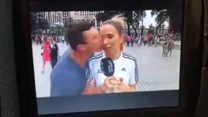 La periodista del grupo Mediaset 5 María Gómez, que se encuentra en Rusia para la programación especial de Tele 5, Cuatro y Be Mad con motivo del Mundial de Fútbol, ha denunciado un nuevo caso de acoso a mujeres del que ha sido víctima ella misma mientras elaboraba frente a la cámara desde una calle de Moscú una previa del partido de octavos de final de mañana entre Rusia y España. La reportera ha colgado en su cuenta de Twitter un vídeo en el que puede verse cómo un hombre se le acerca por detrás, le da un beso en la cara de manera sorpresiva y sale huyendo mientras la periodista se vuelve indignada. Este es al menos el cuarto caso de acoso de aficionados que sufren las periodistas en Rusia mientras desempeñan su trabajo en la calle, una situación que la propia María Gómez había denunciado públicamente esta misma semana.