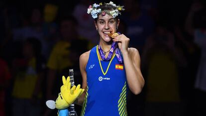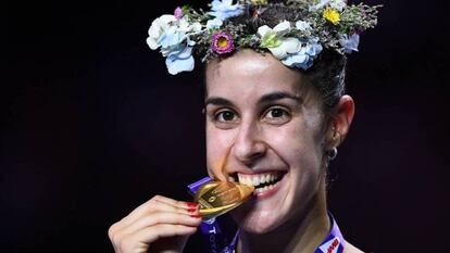 Lloró, gritó, saltó y se abrazó con Fernando Rivas, su entrenador, como si no hubiera mañana. Carolina Marín ya es eterna. En España, icono del bádminton nacional, y en el mundo, con más campeonatos mundiales que nadie. La española (Huelva, 25 años) consiguió este domingo su tercera corona contra Pusarla Sindhu (21-19 y 21-10) y entra en la leyenda tras una exhibición en Nankín (China). Marín, reciente campeona de Europa, recupera la hegemonía del bádminton tras un 2017 irregular. La exhibición de la española en el segundo set fue espectacular y la pone de regreso en lo más alto. Y esta vez para quedarse. Marín ya es eterna.
