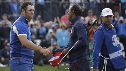 “Ganar ese punto ha sido todo una erupción de emociones”, continuó Rahm. Tan exigente consigo mismo, el vasco sentía que había defraudado al equipo perdiendo los dos primeros partidos de fourballs, con Justin Rose el viernes y con Ian Poulter el sábado. Tuvo que intervenir el maestro Olazabal para calmarle y para hacerle ver que no se acababa ahí el mundo, que pronto tendría otra oportunidad, que lo importante era la victoria final. Rahm lo procesó, pero en su interior sabía que solo había una respuesta: ganar. Cuando el sábado por la tarde se enteró de que jugaría contra Tiger Woods, todo encajó. “Sentí miedo, nervios y alegría”, explicó. Habló con Sergio García, con Thomas Björn, con Tommy Fleetwood y con su preparador mental, Joseba Del Carmen. Sabía que era su momento.