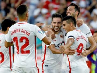 Antes de cumplirse los diez minutos de la primera parte los andaluces ya había cosechado un par de disparos que se fueron por poco, un posible penalti (no señalado) por mano de Osmanpasa y dos goles. El primero llegó tras una rápida concatenación de pases iniciada por Promes tras un saque de banda que parecía inocuo, pero que acabó con Roque Mesa recibiendo el balón más allá de la media luna. El zapatazo entró por la escuadra derecha del portero. Tras el saque de centro, sin tiempo para asimilar el golpe, Aleix Vidal robó el balón en campo contrario y salió disparado hacia la portería. El catalán notó que le agarraban antes de entrar en el área, pero aguantó sin dejarse caer hasta que claramente estuvo dentro. Sarabia, inspirado mientras estuvo en el campo, transformó el penalti con decisión.