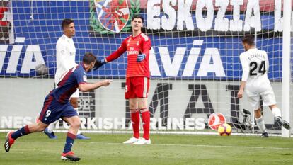 Desde el primer minuto se supo que el Real Madrid no lo iba a pasar bien, tan lejos, con tanto frío. Casi no había comenzado el encuentro cuando Kike García estrelló en el palo una volea que sorprendió a Courtois, tal vez el mejor de su equipo, que solo tiene al Huesca por delante en la lista de equipos más goleados a domicilio, y eso que los aragoneses recibieron ocho goles en el Camp Nou. Poco después marcó Bale en fuera de juego. Le pitaron unos cuantos más, tanto a él como, sobre todo, a Benzema. El Madrid cayó con reiteración en la trampa del Eibar, que cuando tenía la pelota no remoloneaba. Rubén Peña y Cucurella eran dos estiletes por las bandas, donde Odriozola y Marcelo no sabían por dónde les daba el aire. Sobre todo el primero, al que nunca auxilió Bale frente al tormento al que le sometieron Cucurella y José Ángel. Solari no reaccionó para taponar semejan fuga.