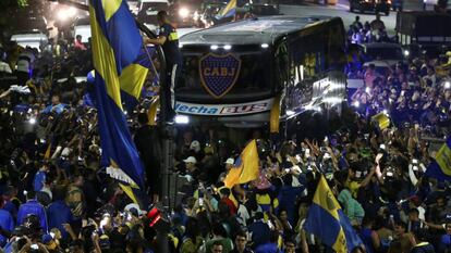 Los aficionados del conjunto xeneize acompañan al autobús del equipo camino al aeropuerto para su viaje a Madrid