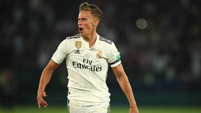 “Risueño” y “bien peinado” seguramente sean dos de los adjetivos superficiales que mejor le definen. Marcos Llorente (Madrid, 23 años) completó durante la final del Mundial de Clubes una secuencia de escenas en las que un personaje secundario habitual como él acabó robando todo el protagonismo a los actores principales, incluso cuando su trayectoria no auguraba más de dos frases hasta hace solo unas semanas. Olvidado por Zidane y Lopetegui, la llegada de Solari al banquillo del Madrid, unida a la lesión de Casemiro, ha permitido a este jugador amante del cuidado físico y de la comida sana (es seguidor de la paleodieta: productos biológicos, pescado, carne, pollo, arroz, algunas legumbres y leche sin pasteurizar) despuntar en el tramo final de un 2018 en el que ya no contempla ninguna salida en el mercado de invierno.