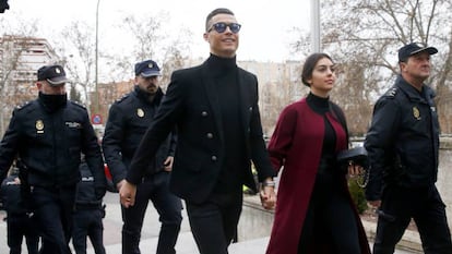 Se abrió la compuerta de una furgoneta negra y salió Cristiano Ronaldo del brazo de su pareja, Georgina Rodríguez. El cielo estaba encapotado y hacía un frío punzante en Madrid pero el condenado ni se quitó las gafas ni dejó de mostrar sus dos hileras de dientes, perfectamente regulares, mientras sonreía a las cámaras. Había unas 50 alineadas en las escaleras que le condujeron a la Audiencia Provincial.