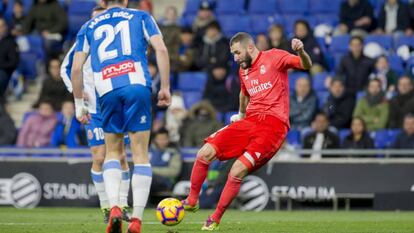 Dotado con la intuición del desmarque, Benzema se ofreció a sus defensas y a sus volantes para iniciar los ataques. Tanto o más que Modric y Kroos, el francés fue la primera opción de pase de sus compañeros cada vez que recuperaron la pelota. Sus combinaciones precisas contribuyeron a desgastar al Espanyol ahí donde se hace fuerte, con el control de la pelota alrededor de Marc Roca. Esto se hizo especialmente evidente a partir del 0-2 de Ramos. Con el viento a favor y el rival aturdido, Benzema brilló con más fuerza que nunca. Incluso como nueve. “Soy un nueve con alma de diez”, dijo él al salir del camerino, según mostraba su dedo roto en el Benito Villamarín y daba fe: “Me duele, pero me olvido”