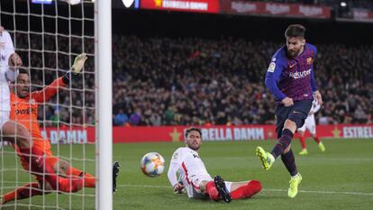 Coutinho transformó la pena máxima que le concedió Messi, derribado por Promes, mientras Rakitic remató una asistencia preciosa y precisa de Arthur. El brasileño metió por fin un pase profundo e inteligente que evocó a su ídolo Xavi. Y, en medio, Cillessen emergió providencial para sacar un remate de tacón de André Silva y posteriormente rechazar el tiro desde los once metros de Banega después de que Piqué derribara en el área a Roque Mesa. Tocaba y llegaba el Sevilla, muy aireado por los costados, especialmente por el del velocista Promes, y encaraba con determinación el Barcelona. La tormenta barcelonista se desató nada más salir del vestuario en el descanso cuando contaron dos goles en tres minutos y se puso 4-0.