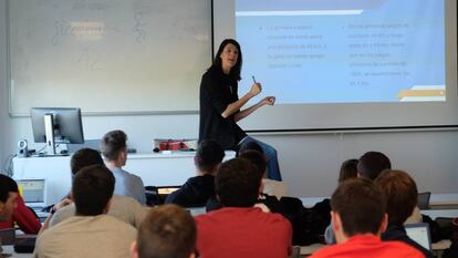 La saltadora, que cumplirá 40 años el próximo día 1, colgó las botas en octubre de 2017. Dice que no le costó, que no sintió ansiedad, ni tuvo vértigo, ni ha llegado a aburrirse. Tampoco tuvo miedo al después. “Es algo que tenía preparado con la psicóloga”, afirma. La misma que la ayudaba a controlar los nervios en competición. “La vida me ha demostrado que se puede disfrutar desde otro lado. Soy hiperactiva, necesito hacer un montón de cosas y llenar todos los espacios de mi agenda. Es genial poder subir montañas, patinar, andar en bicicleta, aprender a jugar al tenis. He empezado a esquiar. Hago un montón de cosas que antes no había hecho porque solo me dedicaba a saltar”, explica mientras sus alumnos se dividen en grupos de 12 para preparar una presentación sobre historia del atletismo. “¡No se puede salir aquí a hablar con las manos en los bolsillos!”, les regaña explicándoles la importancia del lenguaje corporal. Palidece cuando uno de los grupos dice que los Juegos de Barcelona se organizaron en 1922.