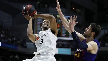 Apuró Smits su estado de gracia y desató al Barça en el perímetro con dos triples que, sumados a otro de Heurtel, consolidaron una sístole y diástole dominada siempre por los azulgrana (29-38, m. 17). Asumiendo a su pesar el papel de perseguidor, el Madrid apretó los dientes para no permitir el demarraje rival antes del descanso. Pero al tercer triple sin fallo de Carroll le siguió el segundo de Kuric y los de Pesic se marcharon a los vestuarios con cinco puntos en la hucha y el ritmo y las sensaciones a su favor, como marcan los biorritmos actuales del clásico (40-45, m. 20).