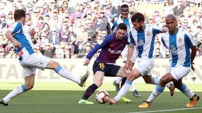 No hay goles tontos ni jugadas afortunadas si de por medio está el 10. Las acciones del argentino son genialidades, sus intervenciones se festejan como únicas, sus faltas ya son célebres y sus partidos son un martirio para el Espanyol: 25 tantos en 33 derbis, 31 en la Liga porque también marcó el 2-0, 10 derrotas blanquiazules seguidas en el Camp Nou. Messi marcó las diferencias en un partido tranquilo, sin pleitos, escaso de fútbol por la palidez del Barça, afectado por el virus FIFA, y la sumisión del solidario Espanyol: defendió, compitió y sufrió para perder sin que mediara Piqué.