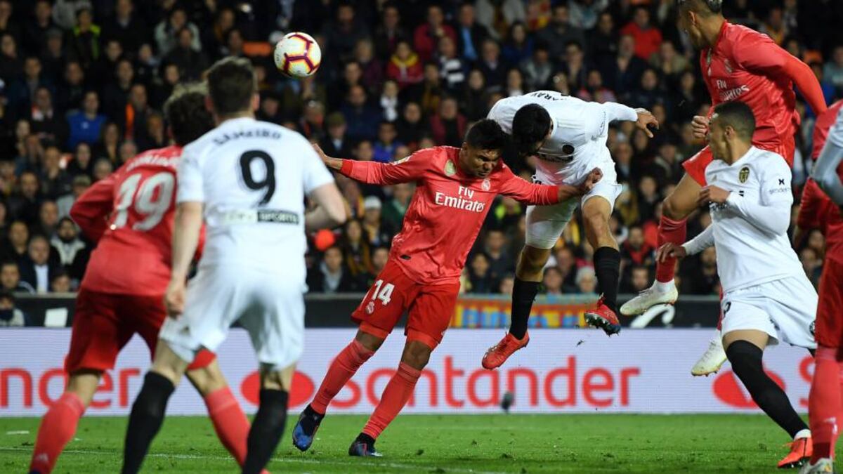 El partido se puso en marcha con mucha emboscada, mucha guerrilla. La gente mordía como loca por birlar la pelota. Con tanto tonelaje, Mestalla resultaba selvático para el equipo que quisiera dar dos, tres toques seguidos. Más era imposible. Todo, lo de unos y lo de otros, se fraguaba en medio campo. Nadie daba con el remedio para progresar hacia las áreas. El Madrid abortaba los contragolpes del Valencia, su especialidad. Y los locales, impermeables delante de Neto, frustraban cada ataque estático de los visitantes. Si al cuadro valenciano le faltaba precisión para despegar a la contra, al conjunto madrileño le faltaba ingenio para infiltrarse en el perímetro de Neto. Un Madrid enchufado, pero demasiado cartesiano. Sin gracia en los últimos metros, enclaustrado por las dos líneas de cuatro ordenadas por Marcelino, más el auxilio en campo propio de Rodrigo y Gameiro.