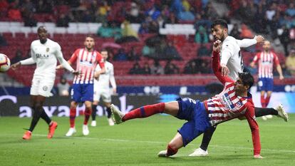 La reanudación pareció una continuación del final del primer acto, con el Valencia ocupando el campo del Atlético dispuesto a dar un golpe de mano al partido. Pero se encontró con una contra que le tumbó. Bien iniciada por Rodrigo, que batió líneas con uno de esos pases verticales que le demanda su entrenador para conectar con Koke. A partir de ahí se desató una cadena de combinaciones al toque entre Griezmann, Morata y Lemar que este terminó de trenzar con una comba templada. A por ella se lanzó Griezmann con todo para anticiparse a Gayà y desplomar a Neto con un cabezazo fino y ajustado. De ese otro palo dio sensación el Valencia de que no tenía pita de recuperarse.