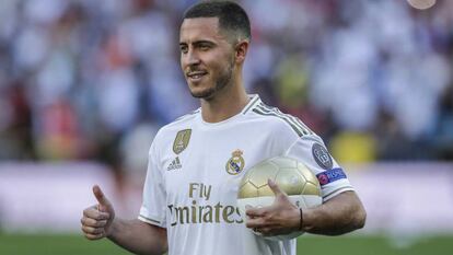 La excitación previa a la presentación de Eden Hazard, el fichaje más caro del Real Madrid —100 millones de euros más 20 en variables—, y su salida al césped de un Bernabéu que mostró una entrada superior a los 50.000 espectadores, rememoró tiempos galácticos. A medida que el Bernabéu iba engordando su figura, el público soñaba en voz alta. “¡Queremos a Mbappé, queremos a Mbappé!”, gritaban pidiendo a Florentino Pérez el fichaje de la estrella francesa, de nuevo espiritualmente presente en el acto. A diferencia de la jornada anterior con Luka Jovic, Hazard pronunció esas dos palabras mágicas que encienden al Bernabéu instantáneamente: “¡Hala Madrid!”, lanzó el belga que, encantado con la estampa, recorrió todos los rincones del campo enviando balones al público. “Tengo muchas ganas de empezar a jugar con esta camiseta y de conseguir muchos títulos. El Real Madrid era mi sueño desde pequeño y ahora quiero disfrutarlo”, dijo el belga, en francés, después de lamentar su flojo castellano.