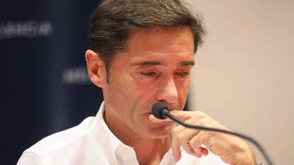 En una extensa rueda de prensa, que pausó durante unos segundos porque rompió a llorar cuando se le preguntó por la despedida del miércoles en el vestuario de Paterna con sus jugadores, Marcelino dijo este viernes adiós. “Os he convocado porque sentía la necesidad de despedirme de la afición”, explicó. Casualmente, el técnico asturiano escogió para hacerlo el mismo hotel que eligió Cesare Prandelli el 31 de diciembre de 2016 cuando presentó su dimisión como técnico del club de Mestalla decepcionado porque Peter Lim no había cumplido con lo que le prometió cuando lo contrató.