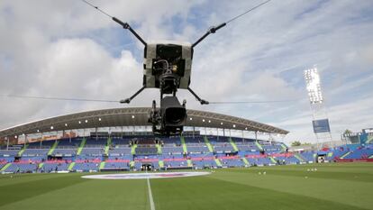 De espaldas Rodríguez y Ferrándiz parecen niños jugando a videojuegos. Desde lo alto ven el partido y van moviendo la cámara cada uno con su consola para ir cambiando los planos. El trabajo debe ser meticulosamente coordinado. Rodríguez tiene que posicionarse en un lugar que le permita a su compañero conseguir la imagen que busca. “Ahora cenital, ¿vale, sky?”, indica el realizador. Entonces el piloto pone la cámara encima del centro del campo y el operador apunta hacia abajo para mostrar desde arriba el saque de inicio tras el pitido inicial. Lo mismo se repite después de cada gol. “Vale, hay cambio”, dice alguien por el walkie talkie. “Se va Cucurella, busca al de la melena”, le dice Rodríguez a Ferrándiz. Entre ambos encuentran al volante del Getafe. Y lo siguen a modo de dron para acompañarlo hacia el banquillo. “Pero esta cámara no es un dron porque está sujeta a una estructura. Por legislación, no se puede volar encima de una gran cantidad de gente”, aclara Rodríguez.