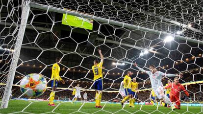 Retocada, España fue otra en el arranque. Pero solo de inicio. Colonizó el juego a partir del balón, Rodri canalizó como ancla, Thiago y Fabián hicieron de ingenieros y Ceballos se ofreció como enganche interior. La pelota fluía en todas las direcciones. Si los suecos bloqueaban por el embudo, por los costados Carvajal y Bernat —más suelto que en Noruega— eran dos ventiladores. Tan decidida y armónica se desplegaba la Roja que en 20 minutos entronizó a Olsen, portero local y flotador de una Suecia sonada ante el ritmo de pase español, favorecido por la movilidad general. Fabián hizo volar al meta del Cagliari, espléndido en un duelo esgrimista con Thiago, al que le sobró un arabesco. Tampoco se achicó Olsen ante Rodri en un córner, ni ante un cabezazo picante de Gerard Moreno tras una precisa asistencia de Carvajal. Nada hacía presagiar un giro, hasta que poco antes de la media hora, el primer saque de esquina a favor de Suecia hizo de sonajero para los de Andersson. De repente se soltó Suecia. A su manera, con su fútbol directo y sin miramientos. De Gea, sobresaliente de reflejos para parar, no estuvo fino cuando quiso dar carrete al juego. Hasta dos veces comprometió a Rodri, al que asistió de espaldas y sin chivatazo. Los dos birles al mediocentro del City pusieron en alerta a La Roja. Turbada también por un remate de Quaison que puso por las nubes a De Gea, con una gran parada a mano cambiada. España se destiñó. No tuvo respuesta al toque de tambores local. La pelota ya no fue su sustento y cada sacudida sueca era una descarga. Suecia dejó de ser un equipo ensimismado ante el coqueteo español con la pelota. La Roja perdió gobierno; Suecia advirtió que sus oleadas afligían cada vez más a los chicos de Robert Moreno. Berg desestabilizaba a la zaga visitante, y Forsberg la tenía en vilo.