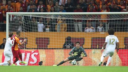 En medio del ruido permanente que convertía el Ali Sami Yen en una caja de resonancia, Courtois bajó el volumen de su portería de la única manera en la que puede hacerlo un portero. El belga extendió su enorme corpachón para taponar un disparo cruzado de Andone en la primera ocasión de peligro que generó el Galatasaray a los nueve minutos, y que daba al traste con el buen arranque de partido del Madrid hasta ese momento. Volvió a hacerlo de nuevo un minuto después, otra vez ante el delantero rumano, para desviar un golpeo peligroso fraguado a partir de un marcaje más que discutible del Madrid en una jugada a balón parado. En apenas 10 minutos había completado su 13ª parada de la temporada, lo que situaba ya el volumen de sus intervenciones por encima del de los goles encajados (12).