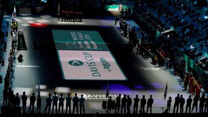 “Coge un trozo grande que lo mismo luego no podemos comerlo dentro”. Una pizza gigante se repartía entre seis adolescentes hambrientos sobre un banco. No venían de ninguno de los colegios cercanos, ni del República del Brasil o del Natividad, donde varias madres esperaban a los pequeños alumnos mientras algún coche salía y le hacía el regalo más preciado del mundo a otro conductor al borde del colapso. “¿Es por esta calle hacia abajo o por la otra?”, pregunta Hans, aficionado alemán al tenis, primerizo en Madrid. Lo primero que hace al llegar es levantar las cejas por la cola que presenta la zona de taquillas. Una vez dentro, un cañón multicolor de luces ilumina la pista sobre la que se va proyectando la bandera de cada uno de los países participantes. Como si de los Juegos Olímpicos se tratase todos los tenistas siguen en fila al portador de la bandera nacional, mientras unas gradas semivacías contemplaban con relativa euforia la escena.