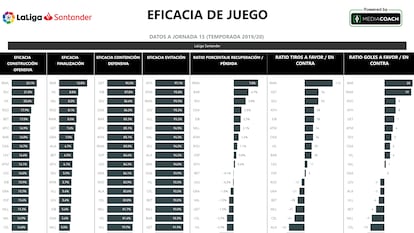 La presión alta del Eibar. Tampoco triunfa todas las veces quien mejor defiende. La SD Eibar de José Luis Mendilibar es el segundo equipo en la tabla de eficacia de "contención defensiva" (quien neutraliza mejor la posesión del rival o, mejor dicho, a quien le generan menos ocasiones claras de gol). Son capaces de frenar el 88% de los avances contrarios gracias a la posición adelantada del equipo en el campo, que suele situarse casi a 50 metros de la portería. Pero, por lo mismo, el riesgo crece. Los guipuzcoanos sufren cuando se rompe su línea de presión y por cada 11 ocasiones de peligro que les crean, les marcan un gol, el peor registro de LaLiga Santander.