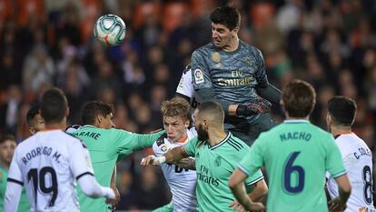 Despegó imperativo el Real Madrid. Gobernante absoluto en Mestalla frente a un Valencia paticojo, limitado a apiñarse en su balcón del área. Un Valencia muy chato que dejó toda la baraja a su oponente. Lo agradeció el Madrid, categórico, sin titubeos. Animado por el excesivo abrigo de su rival. Tan atornillado estaban los de Celades que su apuesta por el contragolpe solo era una alucinación. Sus delanteros, el improvisado Ferran y Rodrigo, no intimaban. Imposible cuando se habita a varias lunas de la portería de Courtois. Así que ante la turbamulta valencianista, el Real estuvo a sus anchas durante la primera media hora.