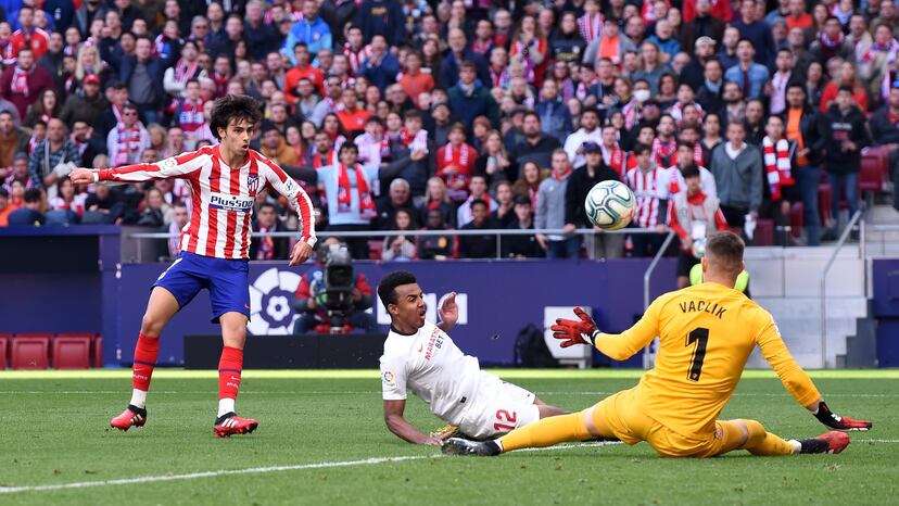 El partido respondió a lo que había en juego y a la altura de dos equipos que de haber estado más finos podrían estar más cerca de la pelea por el título. Fue João Félix, secundado por el revoloteo de Correa y algunas subidas de Hermoso, sustituto del lesionado Lodi, el que elevó el listón del juego desde sus primeras intervenciones. Estuvo exquisito en cada balón que tocó. Apareció siempre al espacio libre y sus compañeros le detectaron con una frecuencia que se ha dado poco en lo que va de curso. Saúl, Koke y Llorente estuvieron concretos en la sala de máquinas. Jugaron a un toque vertical. Recibiendo en las agujas del entramado defensivo del Sevilla, João Félix se gustó. Lo mismo le filtraba un pase a Morata que le dejaba solo ante Vaclik o que tiraba una pared con Koke después de bailar a tres rivales mientras le arrinconaban.