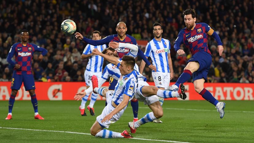 El ruido se acaba cuando se nombra a Messi, siempre aclamado, ni que sea para que no le entre la duda de tomar la puerta de salida, y se pone la pelota en juego siempre que no la toque Ter Stegen. Los espectadores se ponen nerviosos cuando el portero no está preciso con el pie, falto de línea de pase y acosado también por la presión del rival, muy notoria en la Real. Jugaba como una unidad el equipo blanquiazul, muy sincronizado y agradecido en ataque, más vulnerable en cambio defensivamente, amenazado por los desmarques de Braithwaite y la sutileza de Messi, situado de falso 9. La presencia de un tercer delantero como el danés fortaleció de entrada la ofensiva del Barça.