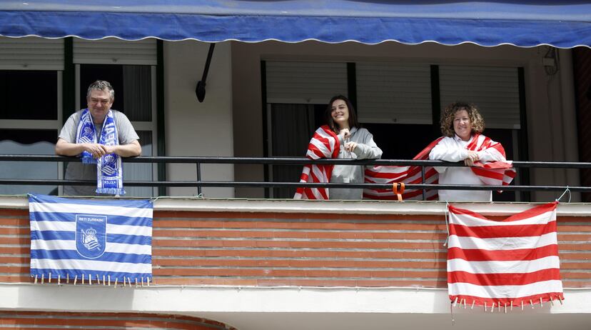 Sin embargo, aún no hay horizonte para la celebración del campeonato de España, y en el confinamiento al que está obligada la población las dos aficiones se han lanzado a los balcones; a jugar desde casa la final de Sevilla. Quien pensaba que a mediodía del sábado estaría tomándose una cañita en la calle Betis, o escuchando el himno de su equipo en la fan zone, se conformó con ponerse la camiseta rojiblanca o txuriurdin, colgar la bandera en el balcón, y corear con sus vecinos el himno correspondiente. Los dos clubes animaron desde sus medios oficiales y publicaron las fotografías enviadas desde el confinamiento, de las ventanas y los balcones que se engalanaron. Hubo hasta una gabarra circulando de un lado a otro de una calle, de balcón a balcón, a través de cables lanzados para ello, en el barrio de Cabieces, en Santurtzi.