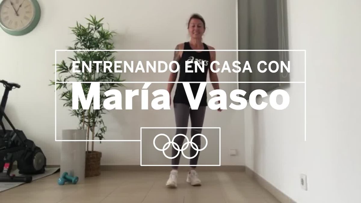 La exatleta María Vasco, medallista olímpica de marcha en Sidney 2000, recomendará a los lectores de EL PAÍS una serie de ejercicios físicos para entrenarse durante el confinamiento. La quinta sesión contempla unos ejercicios con pesas y unas sentadillas con saltos.