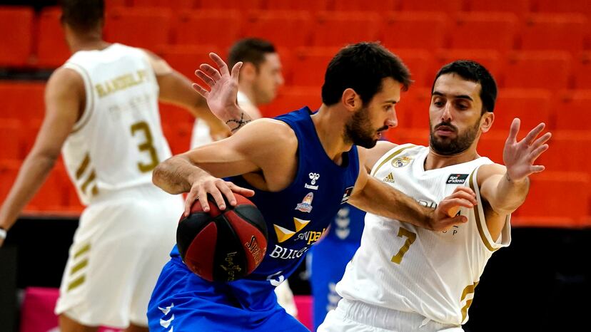 La versatilidad de Rivero, Aguilar y Vega en ataque y los réditos de la defensa zonal terminaron de lanzar al Burgos. El Madrid pagó su pecado de exceso de confianza quedando abocado a una inesperada persecución contrarreloj (65-55, m. 28). Dos triples de Llull, sus primeros puntos en el partido, fueron el único alivio del conjunto de Laso antes de entrar en una exigente recta de meta (68-62, m. 30). La incomodidad frente a la confianza. Ganó el que más lo buscó y lo mereció. El impulso de Llull, con 11 puntos y tres triples en cinco minutos y medio, no bastó para hacer carburar el plan de emergencia. Un error de entendimiento entre Randolph y Campazzo, tras un saque de fondo en los segundos finales, retrató su mal partido y la falta de pulso y concentración que terminó por condenar al Madrid. El Burgos logró la primera victoria de su historia ante los blancos y se mantiene líder del grupo B.