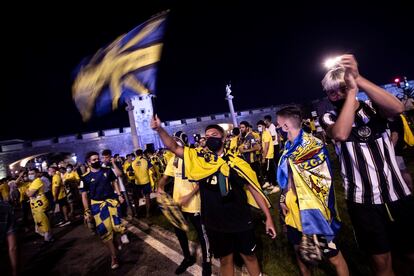 A diferencia de lo ocurrido el sábado a las puertas del estadio, los congregados en las Puertas de Tierra hicieron lo posible por respetar la distancia de seguridad o, en su defecto, llevar mascarillas. Bajo los tapabocas, no era difícil intuir la alegría de multitud de jóvenes que festejaron un ascenso inédito, tras aquel ya lejano de 2005. La fiesta se prolongó hasta bien entrada la madrugada, ante la atenta mirada de unos agentes que no tuvieron que llegar a intervenir para disolver a los congregados.
