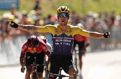Así no actuará Roglic, el esquiador esloveno que ganó la última Vuelta, para quien el Jumbo holandés, su equipo, ha construido un Ineos bis, un superbloque que estos días ha mostrado su brillo amarillo alineado en paralelo con los burdeos del Ineos. Si unos imponen bloqueo respondemos con nuestro propio bloqueo, un Tour doblemente trabado, y a ver quién gana, parecen proclamas los de Roglic, que cuenta para organizarle el tren en la montaña con ciclistas tan buenos y campeones como Dumoulin, Kruijswijk, Gesink y Bennett, tres que han sido o podrían ser líderes de cualquier otro equipo, y con la bestia Tony Martin en el llano, y en el Ain, entre Lyon y Suiza, redujeron triunfalmente la etapa del Grand Colombier, un etapón que se correrá en el Tour, a un <CF1001>sprint</CF> victorioso en los últimos 200m.