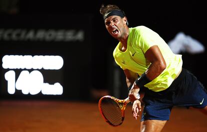 No ha transcurrido ni una hora y Dusan Lajovic, en la silla después de ceder el primer parcial, infla sus pulmones y exhala profundamente resignado mientras sus dos ojos azules miran hacia el frente, en realidad a la nada porque su mente ya se ha ido hacia un limbo. Qué le vamos a hacer, parece decirle su técnico, el catalán Josep Perlas, cuando el tenista gira el cuello y busca algún tipo de respuesta después de haberse vaciado y haberse llevado una bofetada tremenda. Efectivamente, no hay remedio. Rafael Nadal va a toda máquina y termina certificando las buenas sensaciones que obtuvo el primer día en el Foro Itálico: 6-1 y 6-3, rumbo a los cuartos de Roma.
