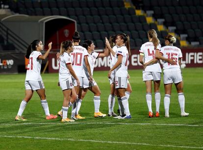 Goles: 0-1. M. 6. Lucía García. 0-2. M. 10. Sivolobova en propia puerta. 0-3. M. 27. Mariona. 0-4. M. 35. Jenni Hermoso. 0-5. M. 38. Lucía García. 0-6. M. 40. Alba Redondo. 0-7. M. 53. Mariona. 0-8. M. 76. Patri Guijarro. 0-9. M. 81. Mariona (penalti).