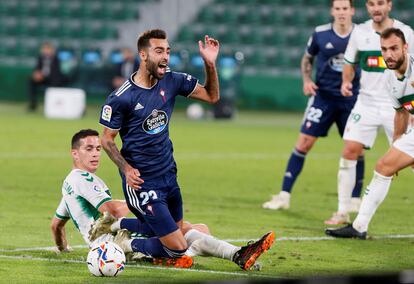 Le costó al Celta templarse. Seguramente lo logró porque su técnico había agrupado a bastantes peloteros en el once. Denis Suárez y Brais Méndez evolucionaron por dentro, detalle que redunda en la lucidez con la que se mueve la pelota. Santi Mina, Iago Aspas y Nolito asomaban por los tres carriles de ataque. El Elche debió soportarlos además en la presión y aunque nunca le volvió la cara al partido, con recursos para solventar esos problemas, empezó a sentirse incómodo.