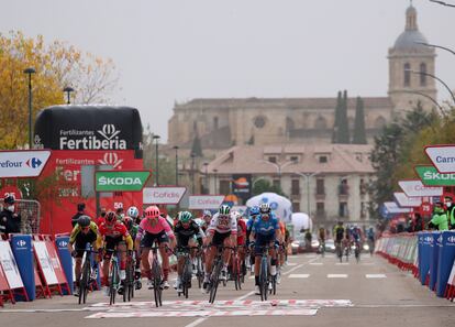 La Orden se transmite. Cuando el Ineos de Carapaz ha terminado su trabajo de aceleración en los ascensos en busca de una mínima falla que no encuentra en el sólido y esférico Jumbo, Imanol Erviti, el hombre del Movistar para todo, toma el mando en el descenso desde el Robledo en persecución del último de la escapada, un salvaje, un caballo loco francés llamado Rémi Cavagna, que se siente como en casa, en su Averno de colinas en la foresta y pueblos antiguos y escondidos por carreteras olvidadas. Mientras varios de varios equipos, ya nerviosos, sudan relevándose en cabeza para lograr que Cavagna rinda por fin los mínimos 15s de ventaja que mantiene irredento durante kilómetros y kilómetros (y en una etapa de montaña se hunde en la mínima elevación de un puente sobre una autovía, a dos kilómetros de la meta), Rojas, de Cieza, le convence a su paisano y jefe Valverde, de Murcia, de que dispute y gane el sprint. Valverde se deja querer, pero al final acepta. A sus espaldas, los oportunistas afilan sus navajas tan fina su hoja como la diferencia entre error de cálculo del pelotón y exhibición del ciclista que le burla, o entre el ardor de trabajar para ser el que decide cómo tiene que ser la etapa y la desazón de ver a uno de rosa, el rápido Magnus Cort Nielsen, sprinter de grupos pequeños y ya experto en victorias en otras Vueltas, saltar por detrás y dejar en nada el sprint largo de Valverde.