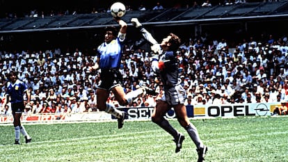 El 22 de junio de 1986, Diego Armando Maradona, fallecido este miércoles a los 60 años, dejó dos de las imágenes más memorables de la historia del fútbol. La selección argentina se enfrentaba a Inglaterra por un puesto en las semifinales del Mundial de México y tras una primera parte en la que casi acaba lesionado, el 10 cambió el partido con dos jugadas en menos de cinco minutos, primero con la madre de todas las polémicas y poco después con una cabalgada imposible que culminó en el conocido como gol del siglo. La primera estampa maradoniana llegó en el minuto 51, después de que el astro argentino condujera un balón hasta el balcón del área y filtrara un pase a Valdano, que no pudo evitar el intento de despeje de Steve Hodge. La pelota se elevó hacia el punto de penalti y Maradona y Peter Shilton corrieron en su búsqueda. El meta llegaba con ventaja, pero en el último momento el delantero saltó y golpeó con la mano izquierda el balón para mandarlo a la red.