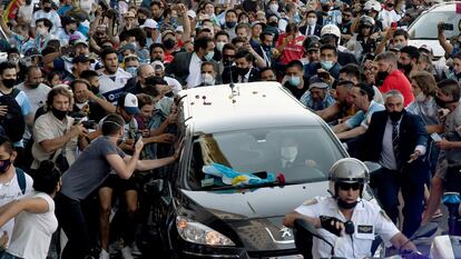 Antes de que la capilla ardiente se abriera al público, la familia cercana, los antiguos miembros de la mítica selección argentina que ganó el Mundial de 1986 y unos cuantos invitados personales, entre ellos el recién retirado Javier Mascherano, tuvieron ocasión de despedir a Maradona en la intimidad y con el féretro abierto. El papa Francisco envió un rosario. El presidente, Alberto Fernández, y la vicepresidenta, Cristina Fernández de Kirchner, se integraron en el círculo próximo. La plantilla de Gimnasia y Esgrima, el club de La Plata para el que Maradona ejercía como técnico, dispuso también de unos minutos de soledad.