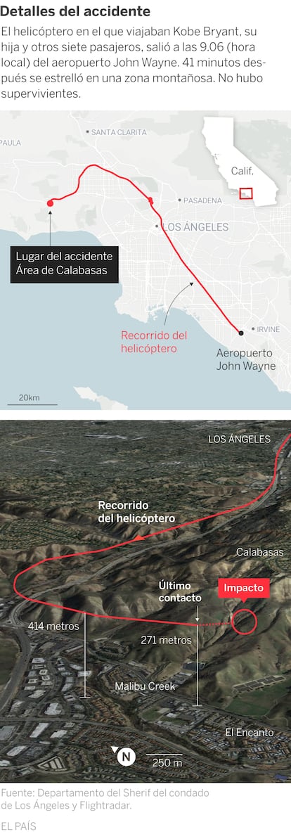 El domingo por la mañana, la región de Los Ángeles amaneció cubierta de una niebla tan espesa que la policía de la ciudad decidió no sacar sus helicópteros a patrullar. Era demasiado peligroso. Tampoco despegaron los aparatos del sheriff esa mañana. "Básicamente por el mal tiempo", reconoció el sheriff, Alex Villanueva. No se veía nada. Kobe Bryant, sin embargo, decidió llevar a su hija y a dos amigas a su partido de baloncesto en la otra punta del condado en helicóptero. Bryant utilizaba este medio de transporte a menudo desde sus tiempos de estrella de Los Angeles Lakers para evitar el tráfico de la ciudad. El vuelo duró 41 minutos. Los nueve ocupantes del helicóptero murieron al estrellarse contra un área montañosa muy cerca de su destino por causas aún desconocidas.