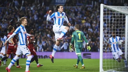 Más de mil seguidores del Mirandés estuvieron en el coliseo donostiarra, junto con los 34.000 de casa, y sufrieron una decepción nada más comenzar. Los nervios del inexperto le jugaron una mala pasada al Mirandés, que a los nueve minutos perdía en Anoeta por un despiste de Odei, que esperó demasiado un balón en el área y cuando fue a despejar se le había metido Portu por medio. El defensa buscaba la pelota y se encontró el tobillo del delantero murciano. Oyarzabal ejecutó el penalti que adelantaba a la Real. El comienzo soñado.