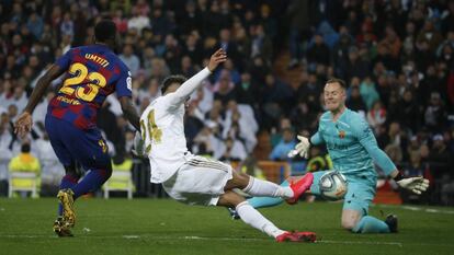 De entrada, quería caminar el Barça. Y quería correr el Madrid. Dos vías diferentes y un mismo destino: la nada, por lo general. Sin marcha, los azulgrana tramitaban el choque a la espera del dictado de Messi. Sin tregua, los madridistas enfilaban a Vinicius. De la vía Messi casi saca provecho el equipo de Setién, que le puso el poco picante del primer acto. No atinó Griezmann tras un lazo entre el rosarino y el pulgoso Jordi Alba. Y Courtois cubrió de maravilla la guardia ante el 10, primero en disparo con la derecha y luego en un duelo esgrimista tras una geométrica asistencia de Busquets. También venció Courtois frente a Arthur, agotado ante el belga tras una carrera maratoniana. De Ter Stegen no hubo pistas. Al menos con las manos. Con Vinicius al tambor, hasta pasado el intermedio, del alemán solo hubo huellas con los pies.