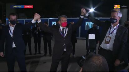 Joan Laporta será el 42 presidente de la historia del FC Barcelona al imponerse con 30.184 votos, el 54,28% del total, el 100% del voto escrutado. Cerrado el escrutinio pasadas las once de la noche, la jornada confirmó una victoria que parecía cantada desde hacía días. El abogado, de 58 años, se impuso este domingo a los otros dos candidatos: Víctor Font (16.679, el 29.99%) y Toni Freixa (4.769, el 8,58%), que le felicitaban con abrazos antes incluso de que se completara el escrutinio. Laporta, que ya presidió la entidad entre 2003 y 2010, regresa al club once años después para afrontar un segundo mandato en un momento en que el club vive una profunda crisis institucional y económica. Especialmente, desde que el pasado mes de octubre el hasta entonces presidente Josep Maria Bartomeu, –hoy investigado por un posible delito de administración desleal y corrupción entre particulares– dejara el cargo después de negarse a convocar el voto de censura por razones sanitarias. Carles Tusquets presidió desde entonces una comisión gestora que ha gobernado el club en los últimos meses.