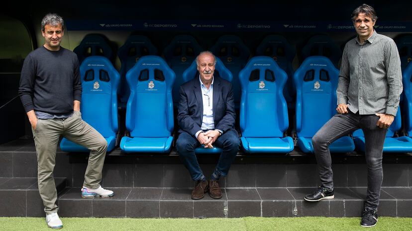 Dos mitos del Deportivo repasan con el exseleccionador la actualidad del fútbol y el agónico estado de su club