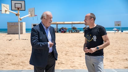 El exseleccionador charla con el árbitro valenciano, que acaba de pitar la final de la Champions y será el colegiado español en la Eurocopa