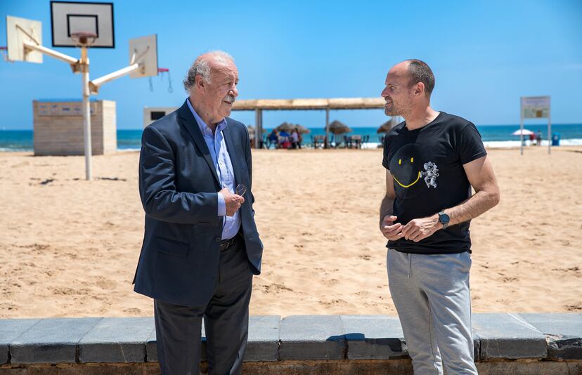 El exseleccionador charla con el árbitro valenciano, que acaba de pitar la final de la Champions y será el colegiado español en la Eurocopa
