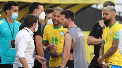 Lo que iba a ser la cumbre del fútbol sudamericano dentro de las eliminatorias para el Mundial de Qatar 2022 se convirtió en un lío monumental y un esperpento planetario. El partido Brasil-Argentina fue suspendido este domingo por inspectores sanitarios brasileños ante la estupefacción generalizada cuando ya había comenzado a rodar el balón. A los cinco minutos de comenzar el clásico sudamericano, funcionarios de la Agencia Nacional de Vigilancia Sanitaria (Anvisa) saltaron al campo del Estadio Neo Química de São Paulo (Corinthians) para exigir que fuera paralizado de inmediato el choque con el argumento de que tres de los jugadores de Argentina que militan en la Premier League y estaban en el campo —Emiliano Martínez, del Aston Villa; y Cuti Romero y Giovanni Lo Celso, del Tottenham— habían mentido al entrar en Brasil después de haber estado en Reino Unido, incumpliendo la cuarentena exigida. Un cuarto jugador —Emiliano Buendía, del Aston Villa—, también acusado de estas infracciones, seguía el partido desde el banquillo.