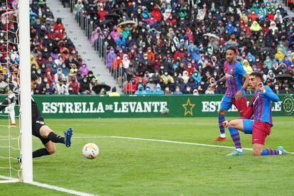 Apenas se contaron remates hasta que Frenkie de Jong prefirió acompañar la pelota a disparar con el portero vencido después de una transición armada por Dembélé. Diego González rechazó el chut en la línea de la meta de Badía. A la contra, siempre decantado por el lado de Dembélé, el Barcelona encontró un trozo de campo y un poco de aire para atacar al equipo de Francisco. El técnico ha endurecido a un equipo sin cosquillas, áspero en su campo, rápido en la transición, selectivo en ataque, fiable en el Martínez Valero. Los movimientos de Pere Milla y las entradas de Mojica por el lateral de Alves no dejaron de atormentar al Barça.