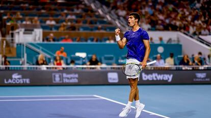 Desposeído ya de su condición de defensor del título, Hubert Hurkacz enfila el vestuario con deportividad. Señala a Carlos Alcaraz, alza el pulgar y dedica aplausos al joven efervescente que acaba de apearle (7-6(5) y 7-6(2) y de alcanzar su primera final de un Masters 1000, entusiasmada la grada de Miami con el talento, el desparpajo y el aplomo del tenista que puede lograr un hito para el tenis masculino español, al que hasta ahora se le ha negado el éxito en Florida. El murciano se medirá este domingo (19.00, Movistar Deportes) con el noruego Casper Ruud, otro primerizo que pisa fuerte estos días (6-4 y 6-1 a Francisco Cerúndolo) y que tendrá ante sí el difícil desafío de ponerle freno al torbellino del momento.