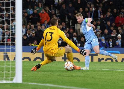 La reducción del radio de acción en el juego de ataque que ha deparado el fútbol moderno ha provocado que los grandes futbolistas amenacen antes de recibir el balón desde el espacio que ocupan. En el partido de ida, Kevin de Bruyne (Bélgica, 30 años) fue una amenaza constante para el poblado sistema defensivo que diseñó Diego Pablo Simeone. El interior belga del City se las apañó para posicionarse a la espalda de la línea que formaban Koke, Kondogbia y Llorente y a la que luego se sumaron Griezmann y João Félix. Por detrás de estos, De Bruyne se situaba entre Savic y Vrsaljko cuando caía a la izquierda del ataque del City y ocupaba el hueco entre Reinildo y Lodi cuando caía a la derecha. Esa posición ocupaba cuando Phil Foden recibió un pase filtrado de Rodri y Reinildo fue a tapar al atacante inglés. De Bruyne aprovechó el espacio liberado por el defensor mozambiqueño para atacar el área, dejar correr el afilado pase que le dio Foden y ejecutar a Oblak con un toque esquinado.