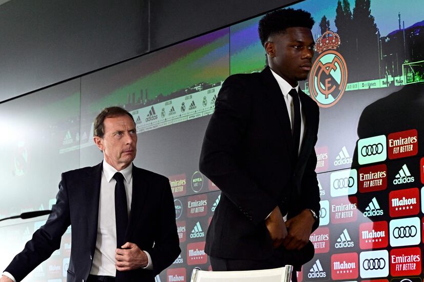 Aurélien Tchouameni pronunció sus primeras palabras en público como futbolista del Real Madrid en una cancha de baloncesto, y después, ya en la sala de prensa de Valdebebas, citó como inspiración a Kobe Bryant y Michael Jordan: “Son leyendas que siempre intentaban perfeccionar su juego para dar el máximo”. En ese momento de su presentación como nuevo jugador madridista, ya hablaba en francés, pero antes, en el parqué, se había arrancado en español, sin papeles, con seguridad: “Estoy muy contento de estar aquí para empezar mi historia con el Real Madrid, el mejor club del mundo. Muy contento. Y vamos a trabajar mucho para continuar ganando más títulos para este club. Gracias al presidente, mi agente y mi familia por estar aquí. Y hala Madrid”, declamó.